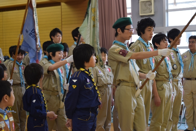 4月12日に千三小学校・多目的ホールで入隊・上進式を行いました 今年1年も入隊・上進スカウト、リーダーの方々と一緒の楽しいスカウト活動になりそうです