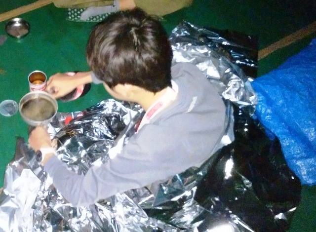 夕食は、とりあえず簡単な寄せ鍋と、防災グッズで指導者から差し入れられた「水を入れるだけでできるご飯」