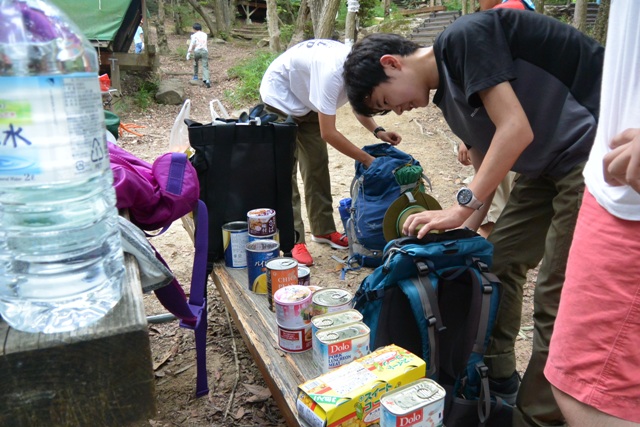先発隊は買い出しも担当しており、ペットボトルの水や缶詰を精一杯担いできました。